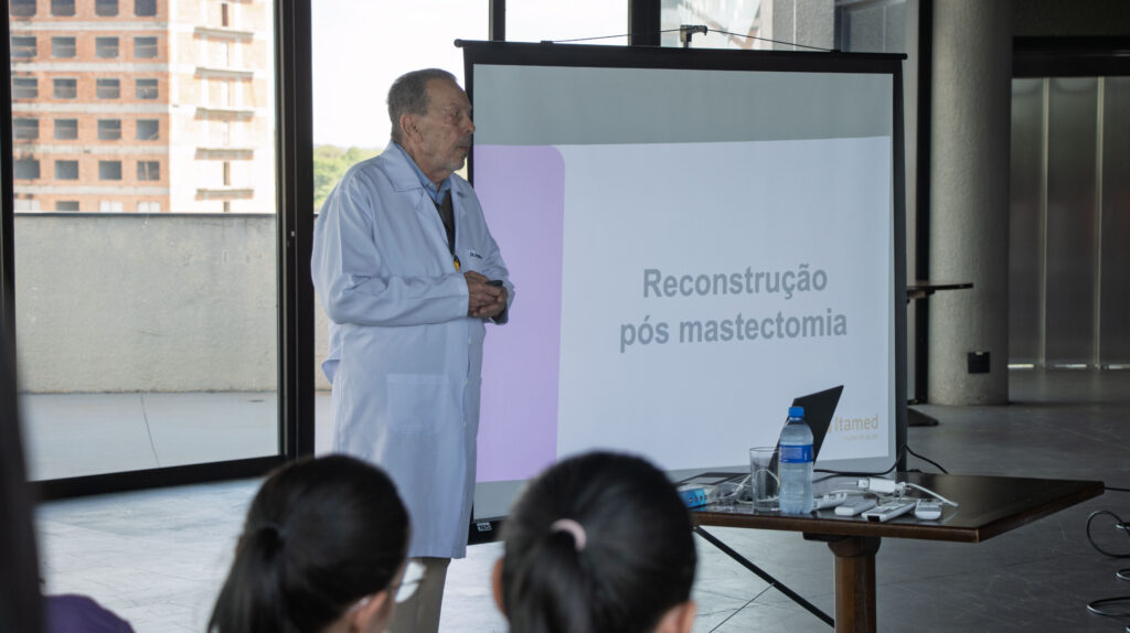 Durante a palestra, o médico destacou que, ao longo da carreira, já realizou quase 4 mil cirurgias, das quais apenas 18 foram em homens, reforçando que o câncer de mama é uma doença predominantemente feminina.
